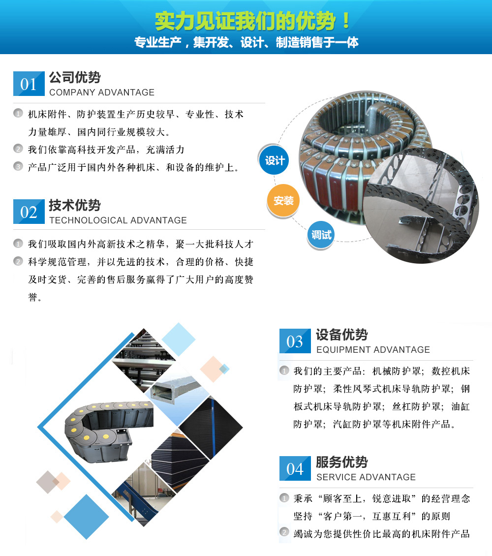 蘇州韻水機(jī)床附件有限公司 ,是專業(yè)生產(chǎn),集開發(fā)、設(shè)計(jì)、制造銷售于一體,是機(jī)床附件、防護(hù)裝置生產(chǎn)歷史較早、專業(yè)性、技術(shù)力量雄厚、國內(nèi)同行業(yè)規(guī)模較大。我們依靠高科技開發(fā)產(chǎn)品,充滿活力,產(chǎn)品廣泛用于國內(nèi)外各種機(jī)床、和設(shè)備的維護(hù)上。我們的主要產(chǎn)品:機(jī)械防護(hù)罩;數(shù)控機(jī)床防護(hù)罩;柔性風(fēng)琴式機(jī)床導(dǎo)軌防護(hù)罩;鋼板式機(jī)床導(dǎo)軌防護(hù)罩;絲杠防護(hù)罩;油缸防護(hù)罩;汽缸防護(hù)罩;耐高溫防護(hù)罩;盔甲式防護(hù)罩;焊接防護(hù)罩;螺旋鋼帶防護(hù)罩;風(fēng)琴式防塵折布防護(hù)罩;醫(yī)療器械防護(hù)罩;精密儀器防護(hù)罩;升降機(jī)防護(hù)罩;鋁型防護(hù)簾;托架式卷簾防護(hù)罩;盒式卷簾防護(hù)罩;自動(dòng)伸縮式鋼帶;機(jī)床排屑機(jī);還有可調(diào)塑料冷卻管... 在線地圖